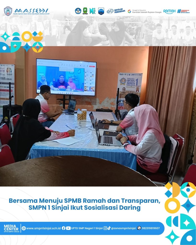 Sinjai, 11 April 2025 – Dalam rangka menyambut pelaksanaan Sistem Penerimaan Murid Baru (SPMB) Tahun Ajaran 2025/2026, Tim Pelaksana SPMB UPTD SMP Negeri 1 Sinjai mengikuti kegiatan sosialisasi secara daring yang diselenggarakan oleh Dinas Pendidikan Kabupaten Sinjai, Jumat pagi (11/04).